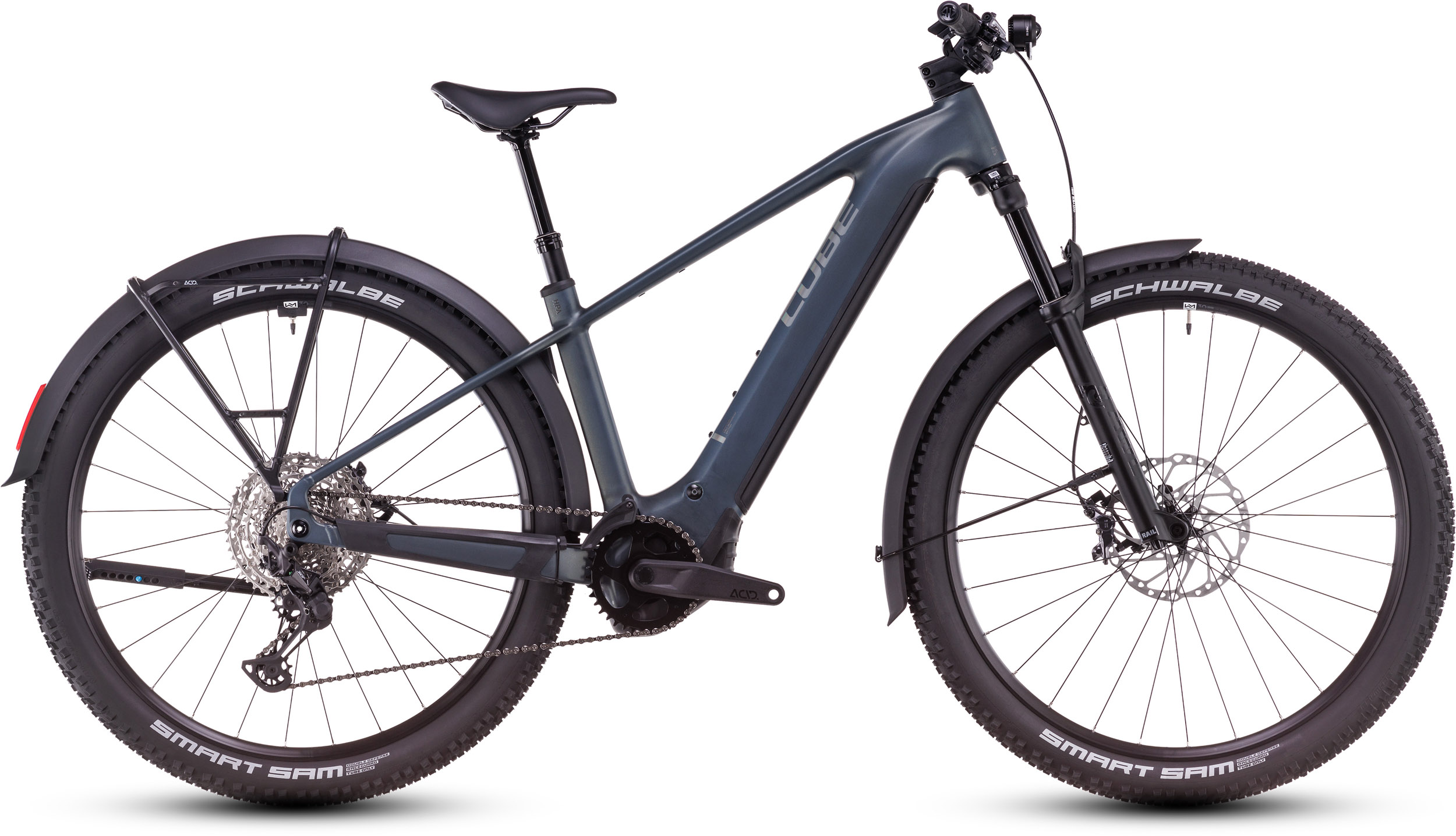 Der Rahmen des Reaction Hybrid Allroad steckt voller cleverer Features – und damit meint Cube nicht nur die integrierten Schutzbleche, den Gepäckträger, die Beleuchtung und den Seitenständer. Sein 800 Wh starker PowerTube Akku und der Bosch CX Motor sind so formschön, sauber und sicher ins schlanke, elegante Design integriert, dass sie kaum auffallen. Außerdem ist das Chassis PowerMore-ready, das heißt, es können bei Bedarf weitere 250 Wh mitfahren. Dazu betonen die integrierte Sattelklemmung und die interne Zugverlegung die cleane Optik. Was noch? Ein UDH für einfache Ersatzteilverfügbarkeit, eine Aufnahme für die Kettenführung und die Möglichkeit, ACID Schutzbleche nachzurüsten. Last, but not least hat Cube dank des Size Split System für so gut wie jeden Fahrer die perfekte Passform im Angebot. Fazit: Alles da, was wichtig ist – für maximalen Fahrspaß!