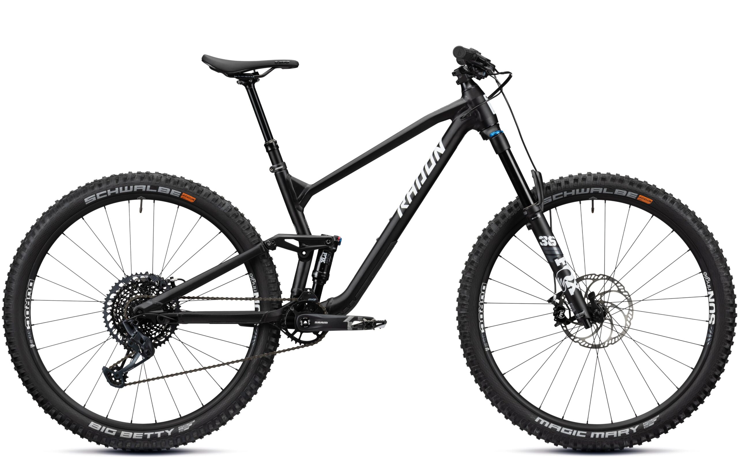 Doch der Reihe nach – das Fahrwerk, bestehend aus einer 150 mm Fox 36 Performance Federgabel und dem neuen Fox Float Performance Dämpfer mit 140 mm Federweg, bietet ausreichend Reserven, um auch in grobem Gelände spielerisch den Trail hinabzufliegen. Um schnell und ergonomisch wieder zum Trail-Einstieg zu pedalieren, kannst Du in Gabel und Dämpfer per Hebel eine Plattform hinzuschalten. Antriebsseitig spezifizieren wir SRAMs GX Eagle Gruppe, die ihre zwölf Gänge zuverlässig und präzise wechselt und Dich mit ihrer großen Bandbreite von 520 % jeden Anstieg nur so hochfliegen lässt – da ist wirklich für jeden Riding-Style und alle Trail-Beschaffenheiten der passende Gang an Bord. Und da der aufgenommene Speed leider auch irgendwann wieder abgebaut werden muss, haben wir auf dem SLIDE TRAIL AL 8.0 eine MT5 4-Kolben-Bremsanlage spezifiziert. Der Klassiker in Maguras Bremssortiment zeichnet sich durch gute Dosierbarkeit und fein einzusetzende Bremspower aus und bietet Dir die benötigte Sicherheit für heiße Trail-Aktion. Auf stabilen und leichten SUNringlé Düroc 35 Expert Systemlaufrädern montieren wir den bissigen Schwalbe Magic Mary an der Front und den beliebten Big Betty am Heck, jeweils in Addix-Soft – Super Trail Ausführung. Damit hast Du Grip satt in unterschiedlichsten Trail-Situationen. Das Race Face Cockpit aus der Æffect R Serie und Kontaktpunkte aus dem Hause SDG runden die Ausstattung unseres beliebten Trail-Bikes stimmig ab. SLIDE TRAIL AL 8.0 – Aluminium lebt!